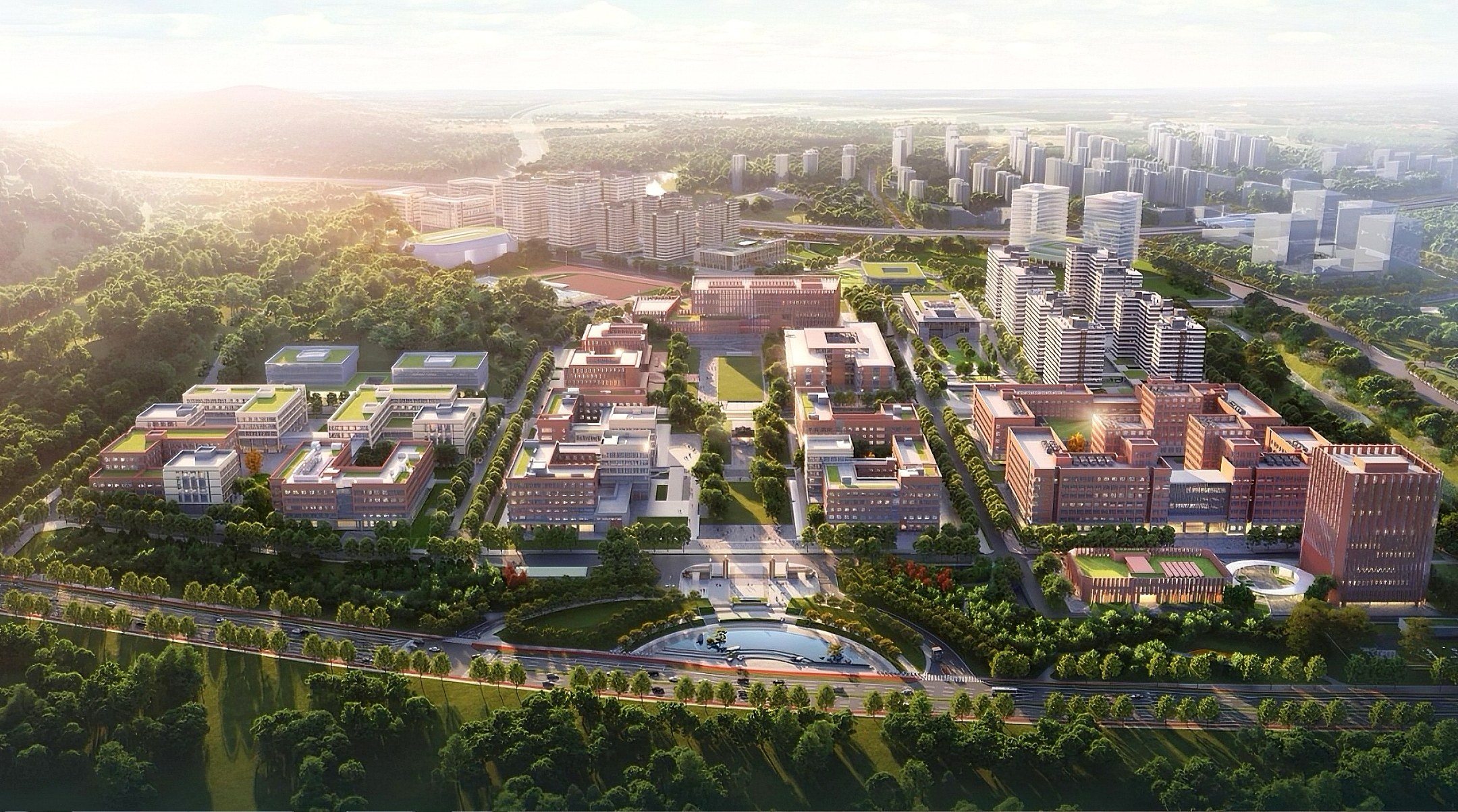 華西樂(lè)城研究院西南側(cè)入口黃昏半鳥瞰